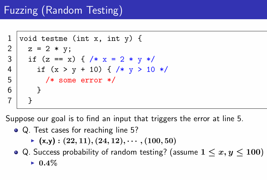 - fuzzing: 다양한 입력 값으로 테스트하지만, 모든 경우를 방증할 수느 없음