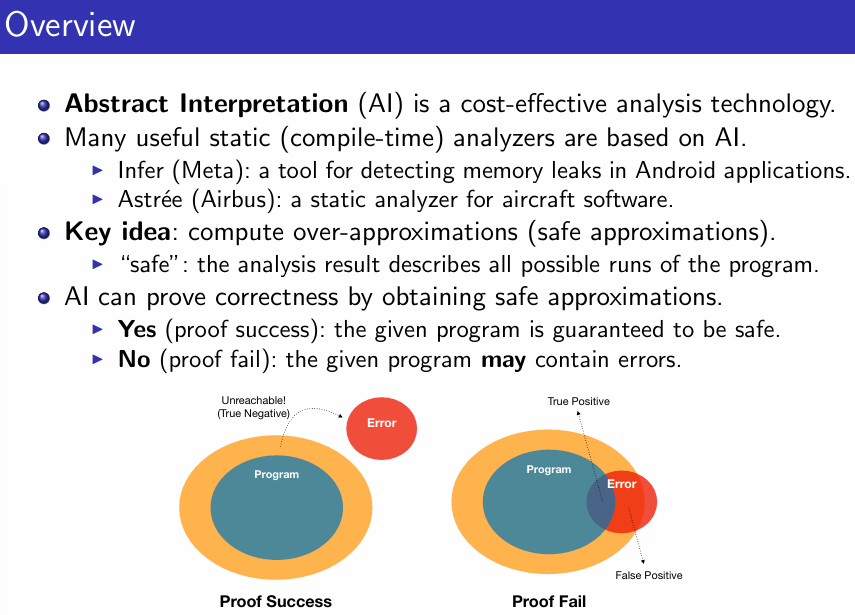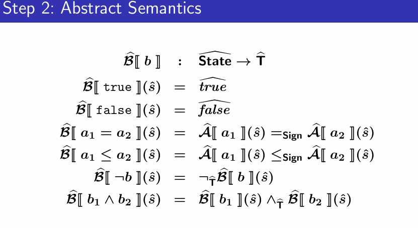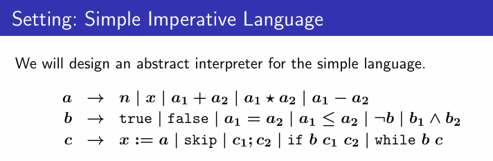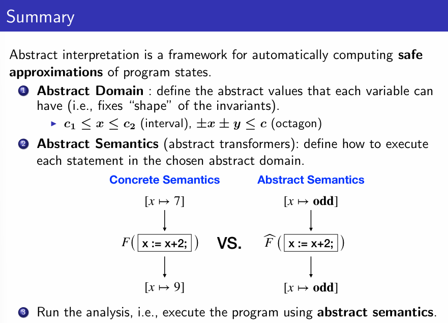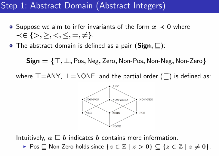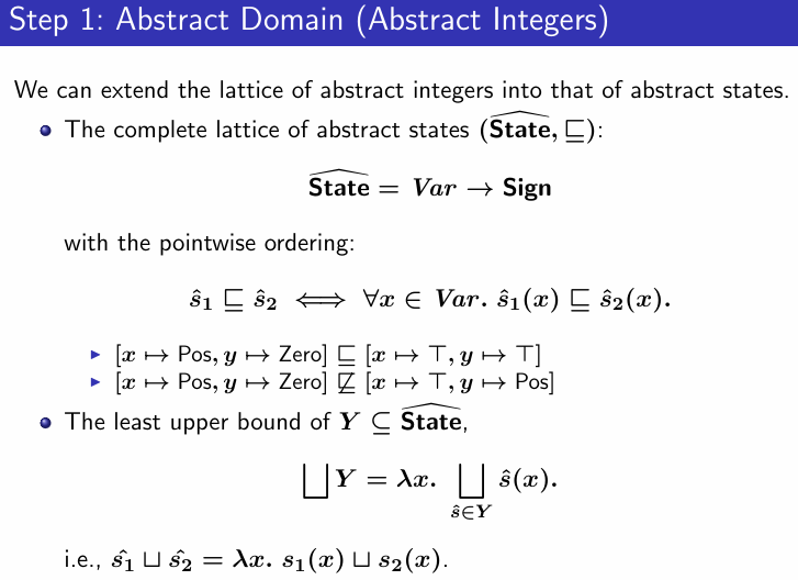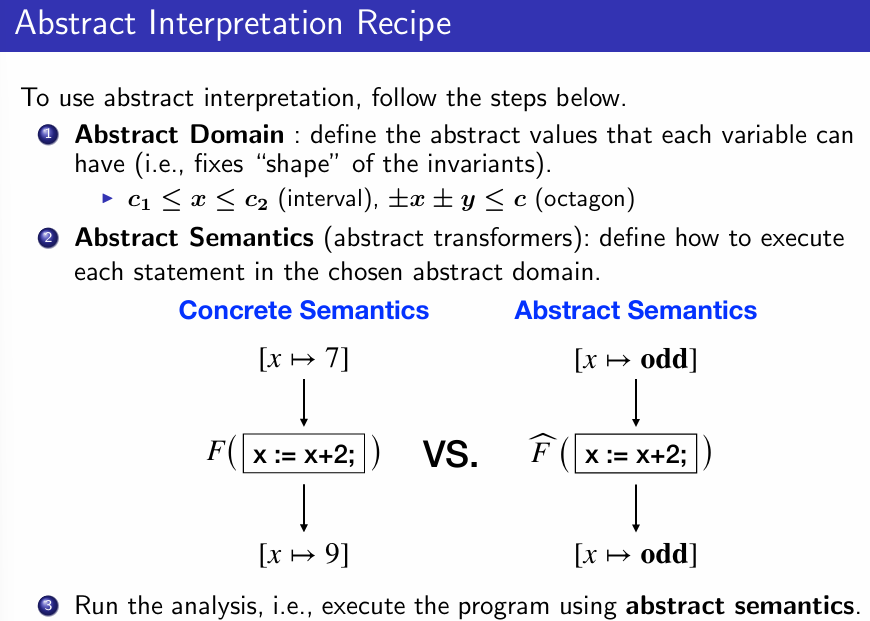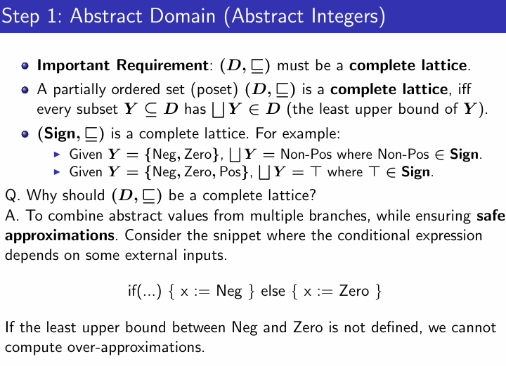- abstract domain: 변수는 구체적인 값 대신 추상화된 값으로 표현 됨