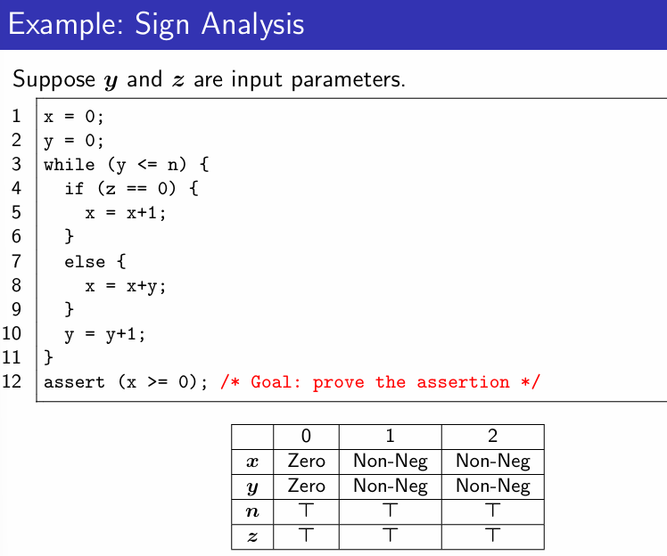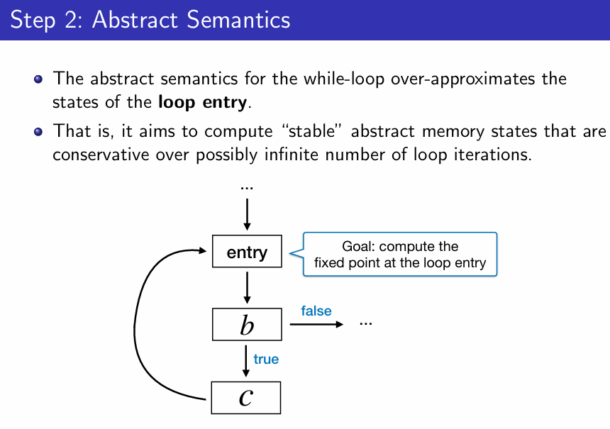 - 반복문: 진입상태를 over-approximation하여 fixed point(상태 변화 없을 때까지)에 도달