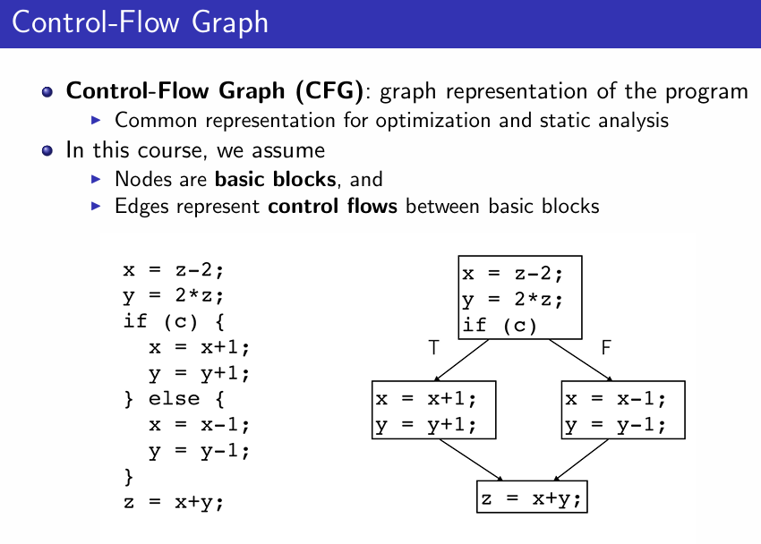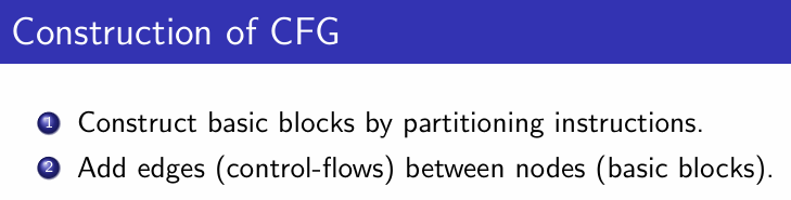 - CFG는 방향 그래프. N은 basic block으로 구성된 노드 집합. 화살표는 control flow를 나타내는 간선 집합