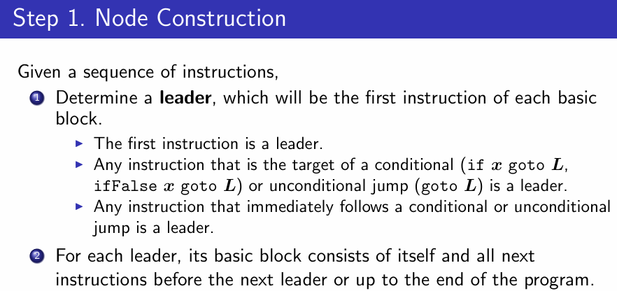 - leader부터 시작해 다음 leader 전까지 모든 명령어를 basic block으로 포함. 프로그램 끝에 도달할 때까지 반복.
