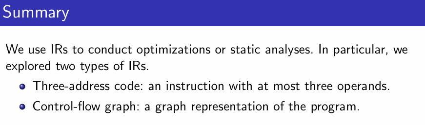 - three address code - 각 식이 최대 3개의 피연산자를 갖도록 함. 단순한 연산 단위로 분해해 분석과 최적화 용이하게.